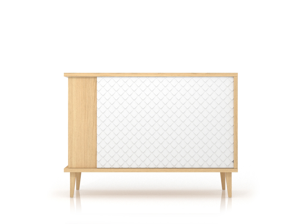 - Frente con Carácter Único: El frontal del módulo de almacenamiento cerrado se define por la combinación de melamina blanca lacada y el panel decorativo N6A. Este panel presenta un atractivo patrón geométrico de líneas diagonales (patrón de escamas simplificado) que aporta una textura visual dinámica y un espíritu retro y elegante. El contraste con la melamina blanca del cajón y el Roble Vicenza circundante es sofisticado y camaleónico, logrando que el mueble de recepción se integre en cualquier ambiente contemporáneo.