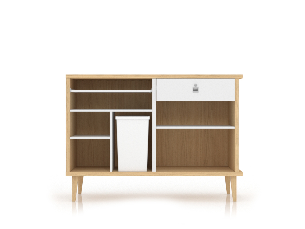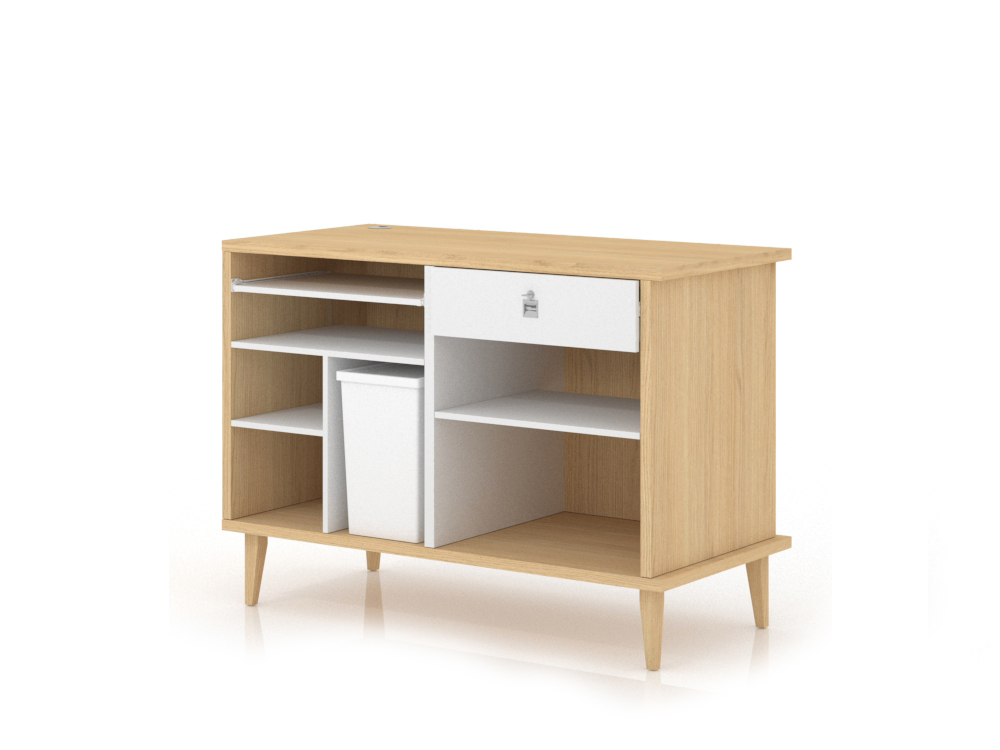 - Módulo 1 (Operatividad y Gestión): Este cuerpo abierto, esencialmente la estación de trabajo, está dedicado a la operatividad diaria. Cuenta con estantes de diferentes configuraciones para la gestión de documentos, material de packaging y suministros. Hemos integrado un espacio específico para la bandeja para PC, que mantiene el equipo informático discretamente oculto y protegido. Además, se ha integrado un compartimento lateral diseñado para alojar la papelera, asegurando que el mueble de caja se mantenga ordenado y despejado.