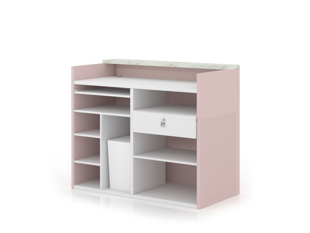 - Sobremostrador en Melamina Mármol Blanco: La superficie superior del mostrador, o sobre, se presenta en melamina de efecto mármol blanco. Este acabado aporta un toque de lujo sutil y luminosidad, actuando como un contrapunto clásico y atemporal al color rosa lacado de la carcasa.