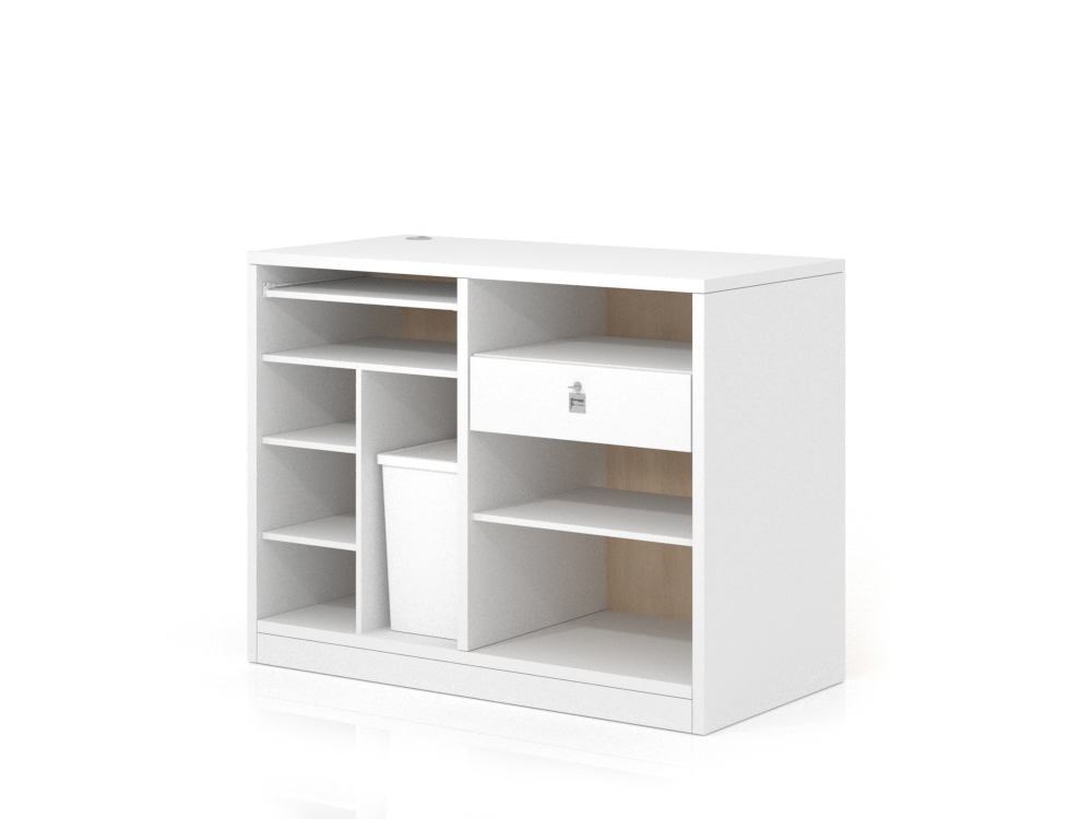 - Carcasa en Melamina Blanca Soft: El cuerpo principal y el sobre están construidos en melamina blanca soft. Este acabado, de tacto agradable y superficie mate, irradia pulcritud y refuerza la luz natural del espacio, proyectando orden y profesionalidad.