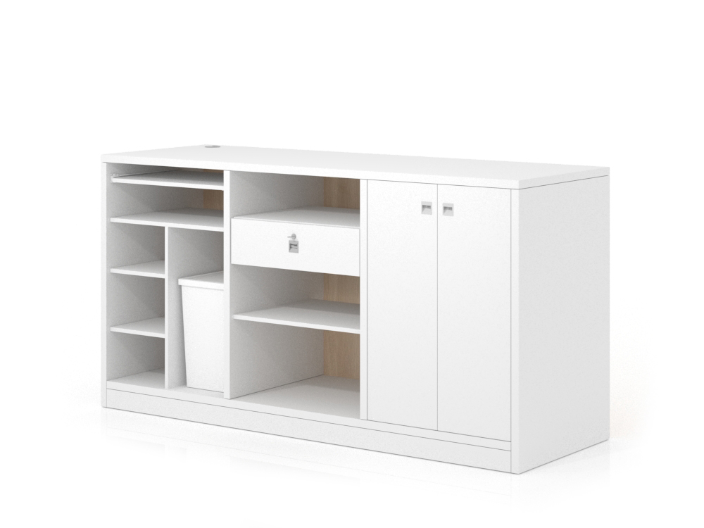 - Módulo de Estantes y Cajón con Llave: Este módulo combina la accesibilidad con la seguridad. Cuenta con estantes para documentos o suministros, junto a un cajón con cerradura. Consideramos que el cajón es indispensable para guardar elementos importantes, llaves o material confidencial, aportando una capa de seguridad crucial para el personal de atención al cliente.