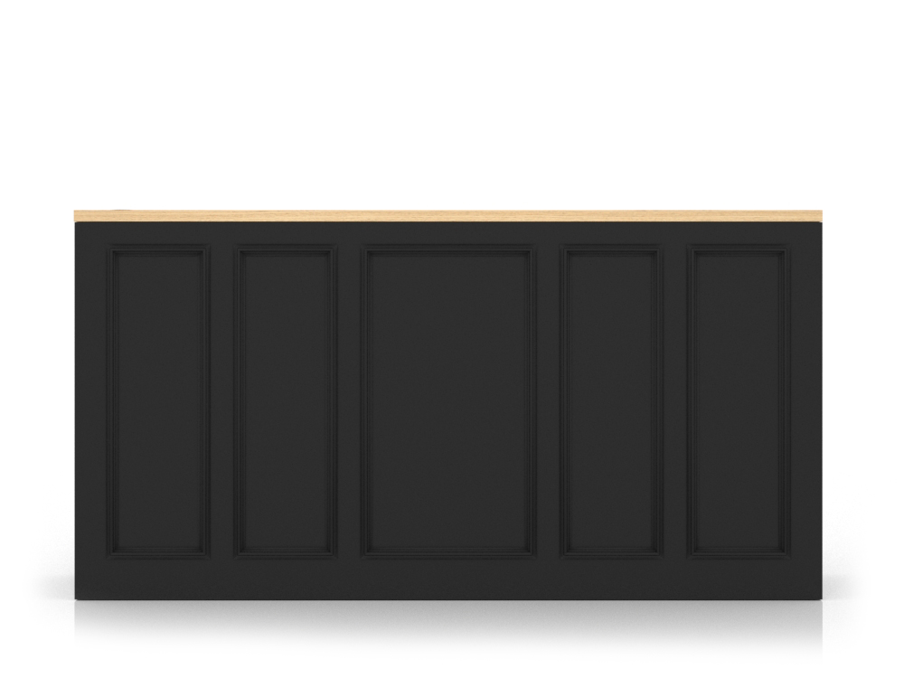 - Encimera Roble Vicenza: La extensa superficie de atención al cliente se remata con melamina de alta protección en acabado Roble Vicenza. Esta encimera ofrece el aspecto natural y el veteado de la madera clara, contrastando de manera espectacular con el negro lacado de la base. El contraste entre la intensidad oscura y la calidez del Roble Vicenza eleva la estética de todo el mueble de recepción. Además, este sobre está específicamente diseñado para ofrecer una durabilidad superior en el alto tráfico del punto de venta.