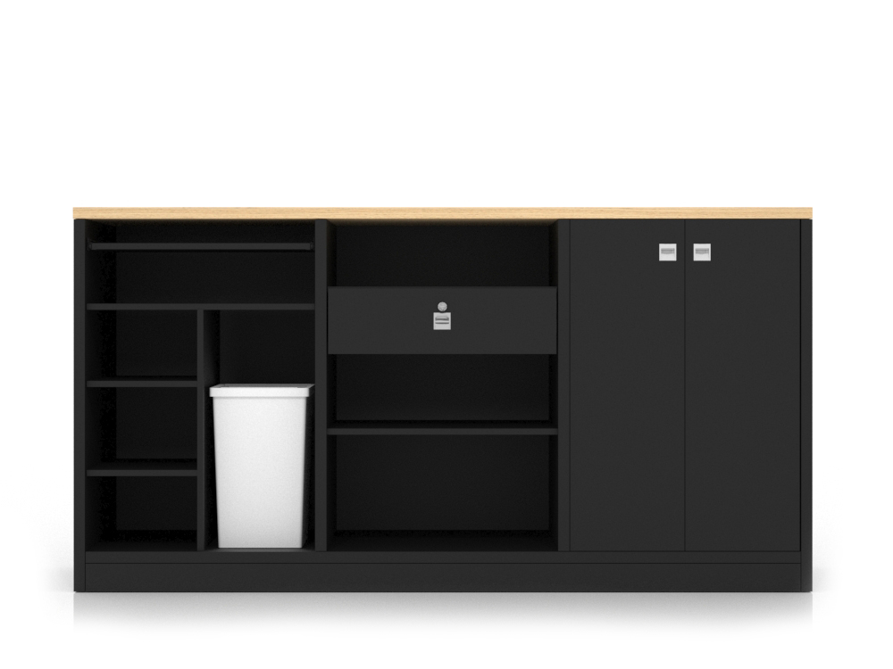 - Incluye un compartimento lateral para la papelera, crucial para mantener la pulcritud del espacio de caja y la imagen profesional.