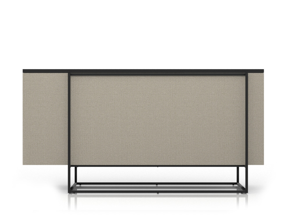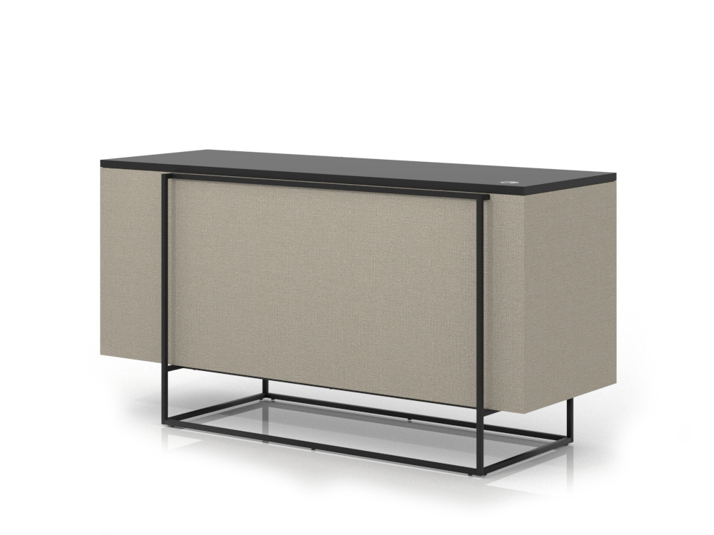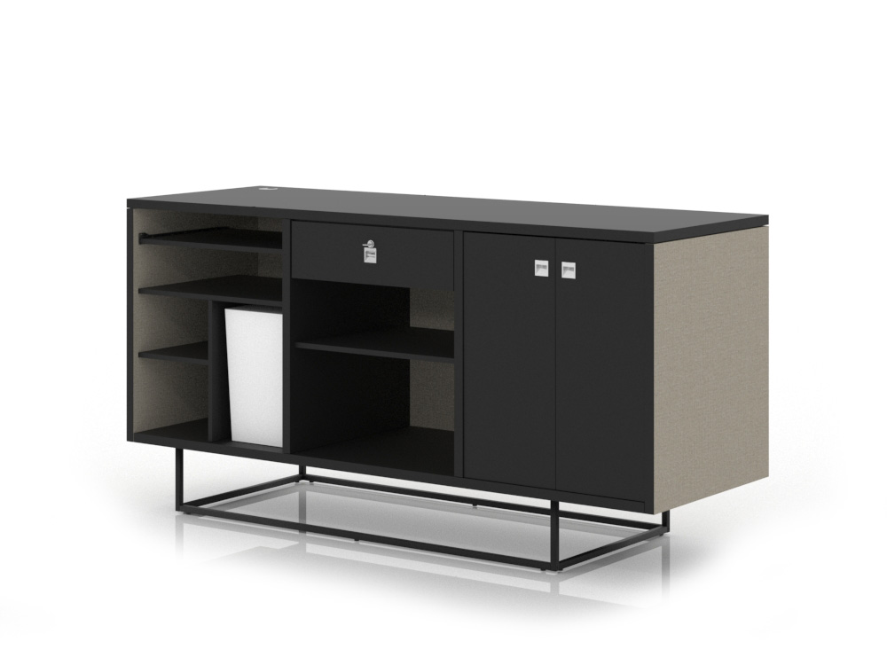 El diseño del Meier se caracteriza por un contraste audaz entre la ligereza de su base y la solidez de sus volúmenes. La sensación de que el cuerpo del mueble flota se logra gracias a la estructura metálica pintada con epoxi negro, que conforma el esqueleto arquitectónico de la pieza. Esta estructura, robusta y con un marcado acento industrial, garantiza la durabilidad exigida en el uso comercial intensivo.