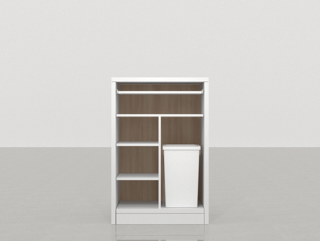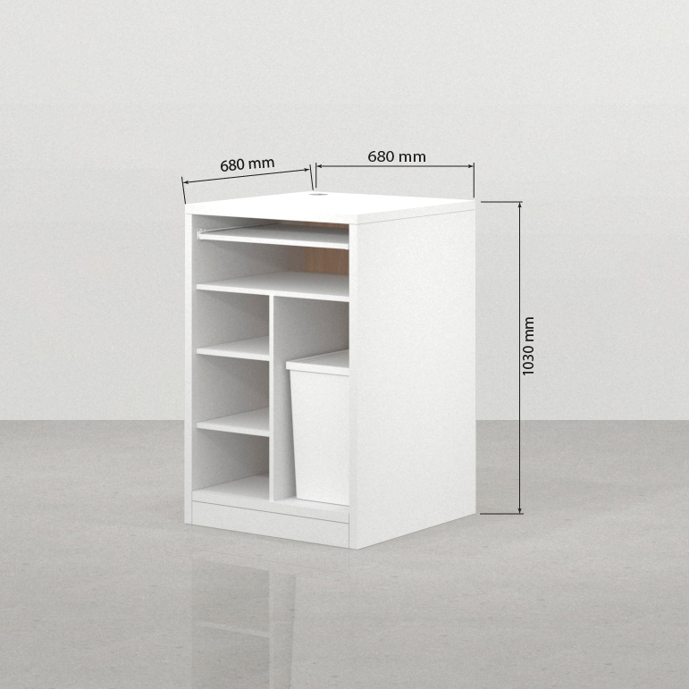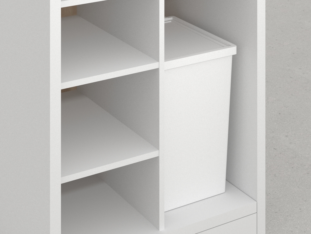 • Papelera Oculta: Un compartimento vertical está diseñado para alojar la papelera de forma discreta y oculta, facilitando la limpieza y organización sin romper la armonía visual del conjunto.