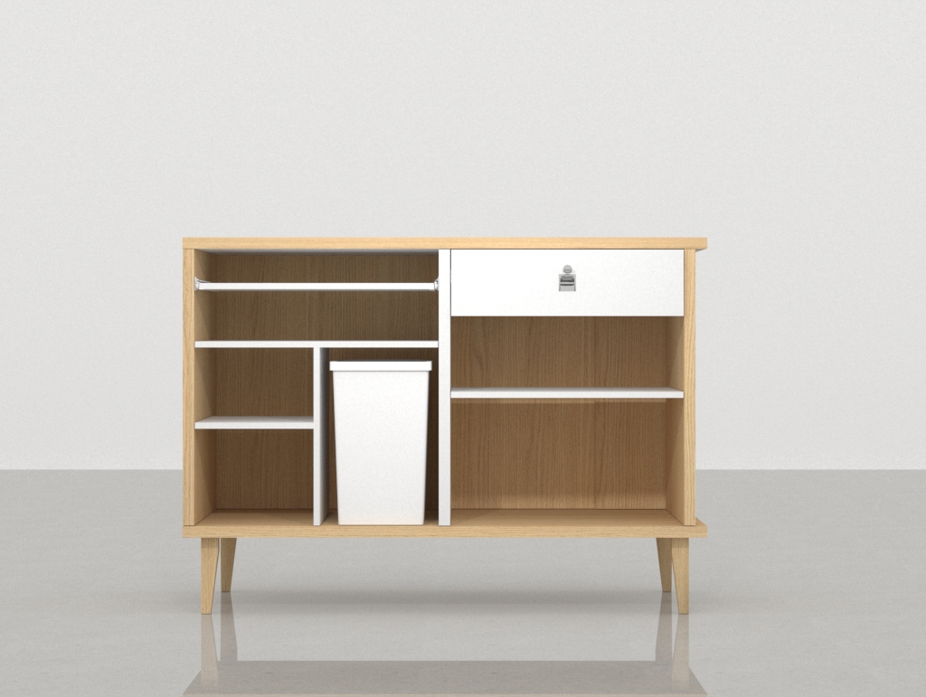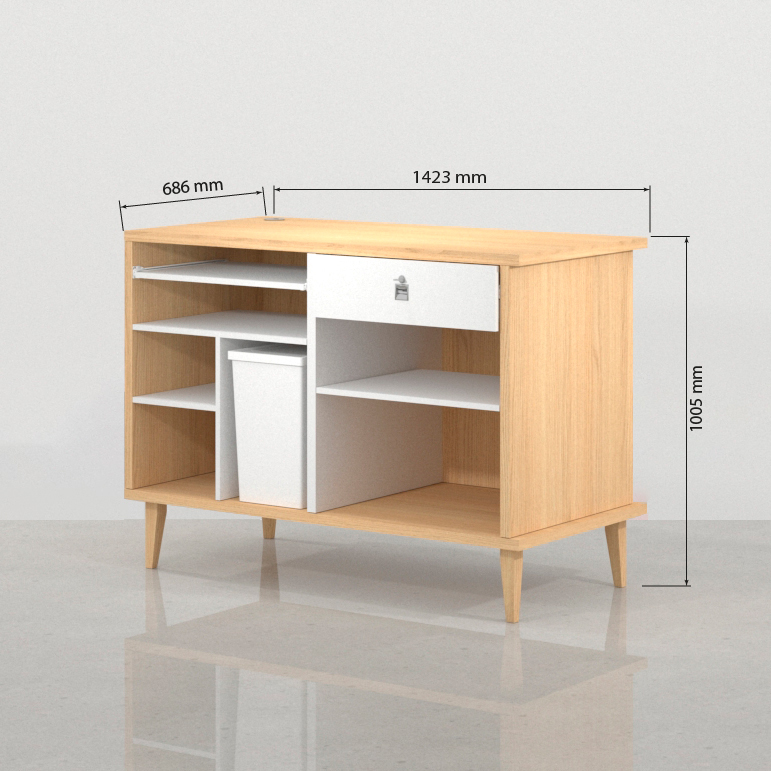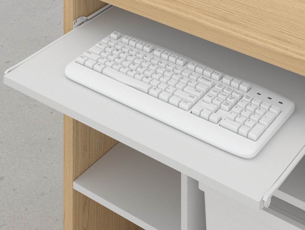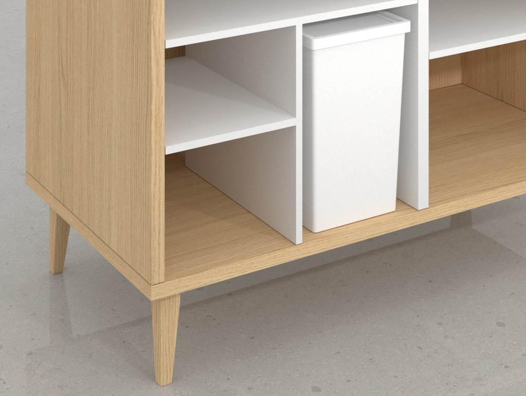 - Módulo 1 (Operatividad y Gestión): Este cuerpo abierto, esencialmente la estación de trabajo, está dedicado a la operatividad diaria. Cuenta con estantes de diferentes configuraciones para la gestión de documentos, material de packaging y suministros. Hemos integrado un espacio específico para la bandeja para PC, que mantiene el equipo informático discretamente oculto y protegido. Además, se ha integrado un compartimento lateral diseñado para alojar la papelera, asegurando que el mueble de caja se mantenga ordenado y despejado.