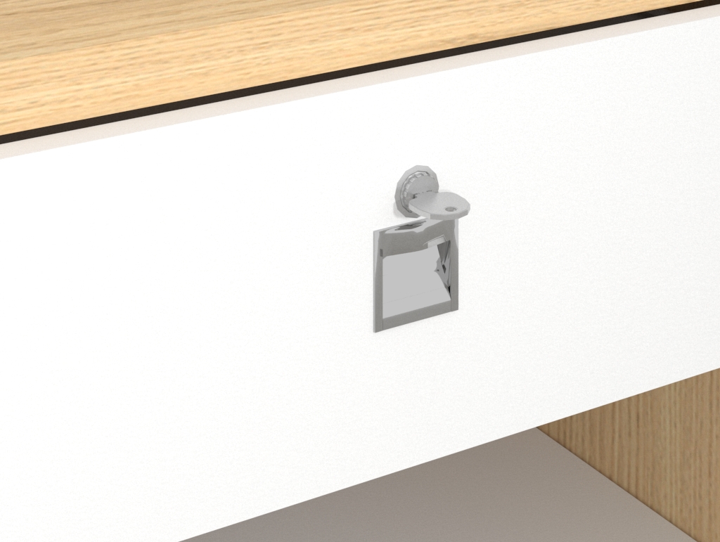- Módulo 2 (Seguridad y Almacenamiento): Este módulo (el de la derecha en la imagen) es el núcleo de almacenamiento seguro y mostrador modular. Combina una sección cerrada con el elemento de diseño del Panel Decorativo N6A para guardar stock o elementos sensibles. Incluye un cajón con cerradura en la estación de trabajo. Este cajón de seguridad es indispensable para custodiar efectivo, datáfonos o cualquier artículo de valor con total discreción.