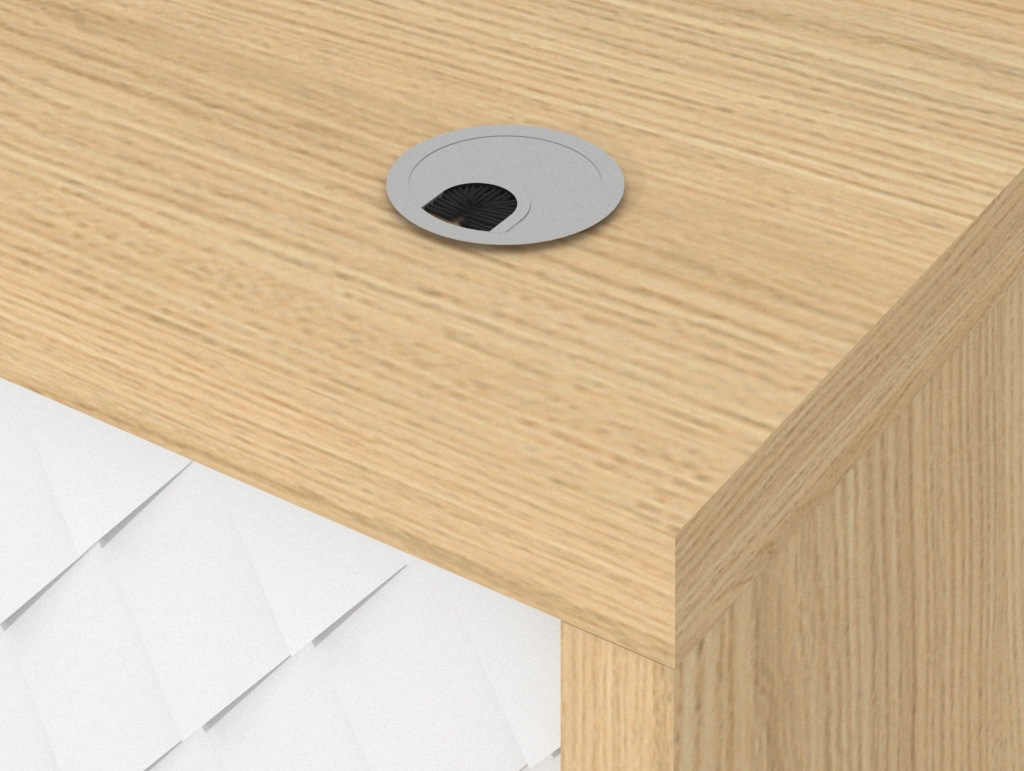 La encimera de ambos módulos cuenta con discretos pasacables para facilitar la conexión ordenada de monitores, TPVs y otros dispositivos, manteniendo la superficie libre de enredos y lista para la interacción con tu cliente. Este enfoque ergonómico asegura que el mostrador de atención al cliente sea una herramienta de trabajo ágil.