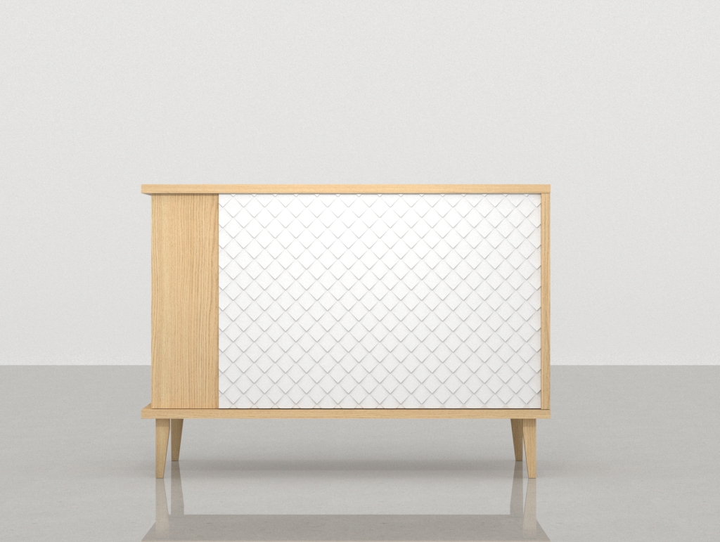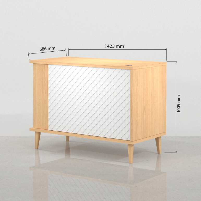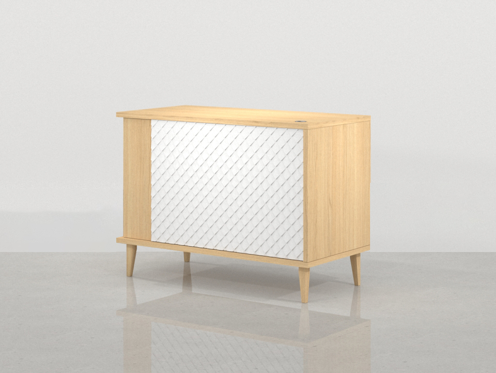 - Frente con Carácter Único: El frontal del módulo de almacenamiento cerrado se define por la combinación de melamina blanca lacada y el panel decorativo N6A. Este panel presenta un atractivo patrón geométrico de líneas diagonales (patrón de escamas simplificado) que aporta una textura visual dinámica y un espíritu retro y elegante. El contraste con la melamina blanca del cajón y el Roble Vicenza circundante es sofisticado y camaleónico, logrando que el mueble de recepción se integre en cualquier ambiente contemporáneo.
