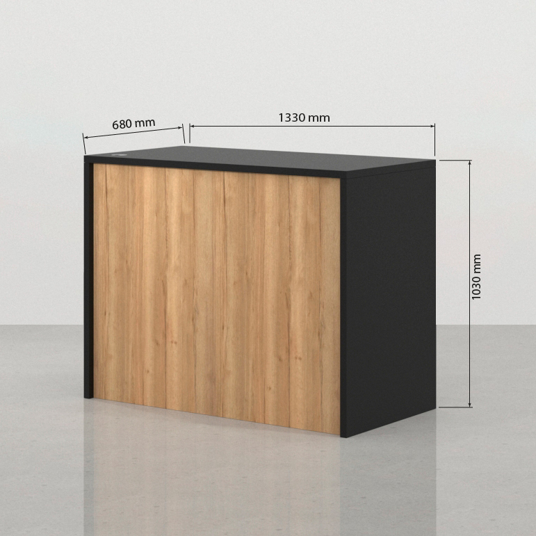 El acabado de este mostrador de dos módulos combina el negro profundo con la textura cálida de la madera, creando un impacto visual inconfundible: