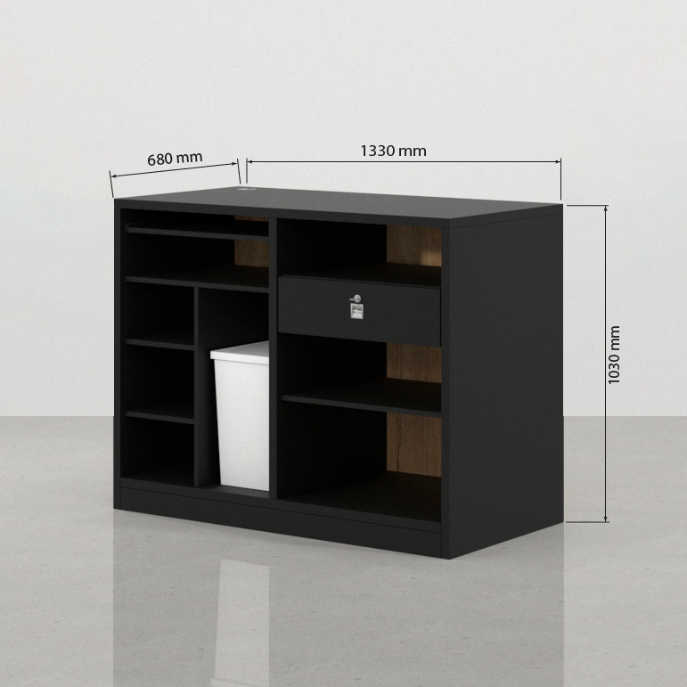 - Carcasa y sobre en Melamina Negra: El cuerpo principal y la superficie de trabajo están construidos en melamina negra. Este acabado aporta profundidad, sobriedad y una base sólida que proyecta orden y una marcada profesionalidad.