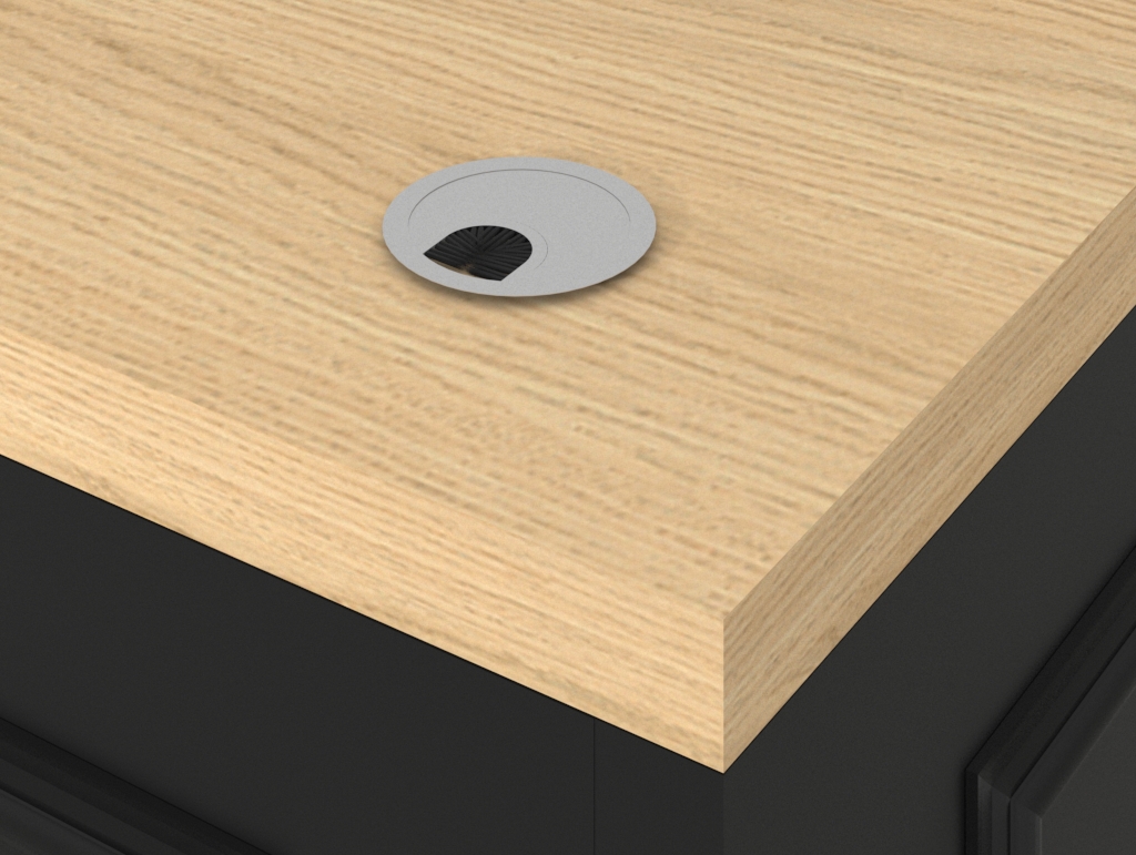 - Conectividad Profesional (Pasacables): La encimera superior cuenta con un discreto sistema de pasacables. Esta funcionalidad es crucial para facilitar la conexión ordenada de monitores, datáfonos y TPVs, asegurando que tu mostrador de atención al cliente se mantenga despejado, profesional y seguro en todo momento.