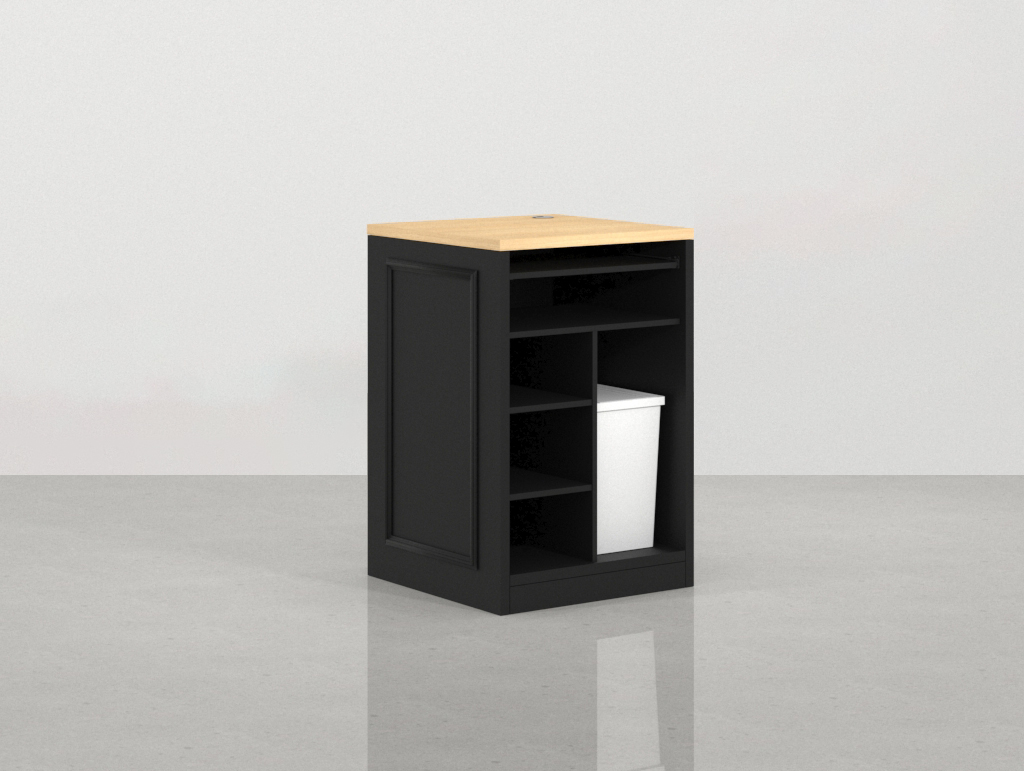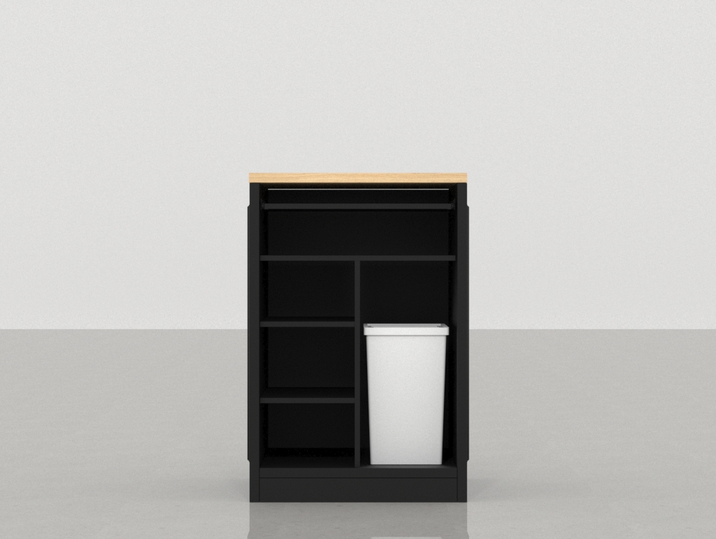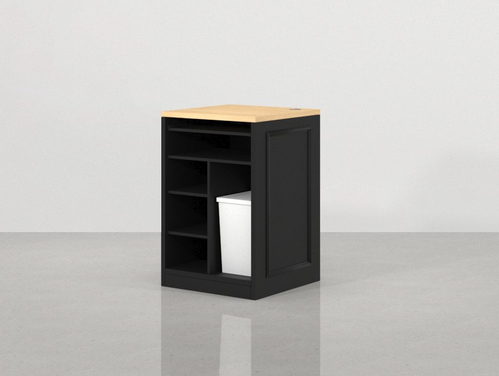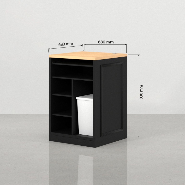 - Orden y Limpieza (Papelera): Pensando en la ergonomía y la pulcritud del entorno de trabajo, hemos incluido un espacio lateral específico para la papelera. Esta característica permite que el ambiente de trabajo se mantenga limpio y ordenado sin que el contenedor obstruya el paso o quede a la vista del público.