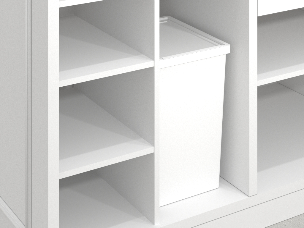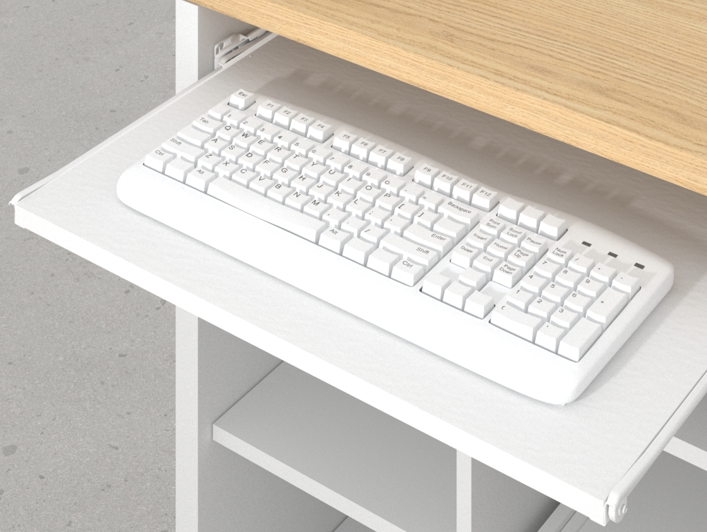 • Módulo 1 (Estantes y PC): Este módulo está totalmente optimizado para la gestión operativa y documental. Cuenta con amplios estantes de diferentes alturas, perfectos para la clasificación precisa de documentos, el almacenamiento de folletos o el material de packaging de forma ordenada. Es crucial la previsión de un espacio vertical específico para alojar la bandeja para PC (unidad central), manteniéndola oculta, bien ventilada y protegida, lo que libera totalmente la superficie de trabajo para la interacción con el cliente.