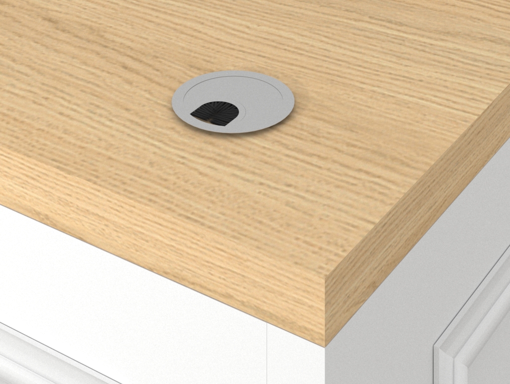 Ambos módulos en la encimera superior incluyen nuestro discreto pasacables integrado. Esta funcionalidad es vital para facilitar la conexión ordenada de monitores, teléfonos y TPVs, asegurando una gestión de cables pulcra y profesional, lo que refuerza la imagen de nuestro mostrador de atención al cliente.