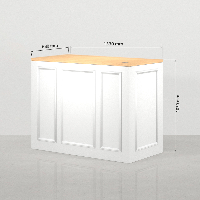• Estructura de Melamina Blanca Lacada con Molduras Solapadas: Ambos cuerpos principales están construidos con melamina blanca lacada, un acabado que no solo proporciona una superficie lisa, luminosa y estéticamente impecable, sino que también es altamente resistente a la abrasión y al desgaste diario propio de un mostrador recepción. El elemento que confiere su identidad clásica son las molduras solapadas lacadas, que enmarcamos en los paneles exteriores. Estas finas molduras elevan el mostrador, evocando el estilo tradicional con una sofisticación pulcra y atemporal.