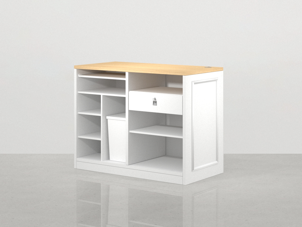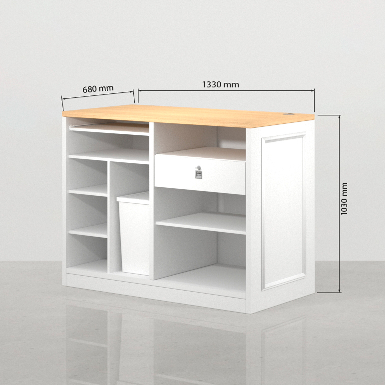 • Módulo 2 (Cajón y Estantes): Este módulo está enfocado en la interacción directa con el cliente, el cobro y la seguridad. Incluimos un cajón con cerradura de alta calidad, esencial para guardar efectivo, datáfonos inalámbricos, documentos importantes o artículos de valor con total seguridad y discreción. Lo complementamos con estantes inferiores para almacenamiento adicional que pueda requerir el acceso rápido.