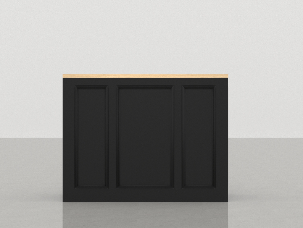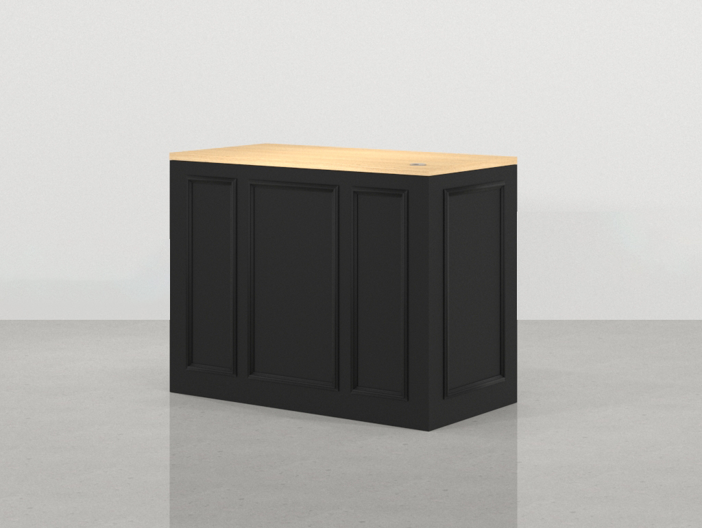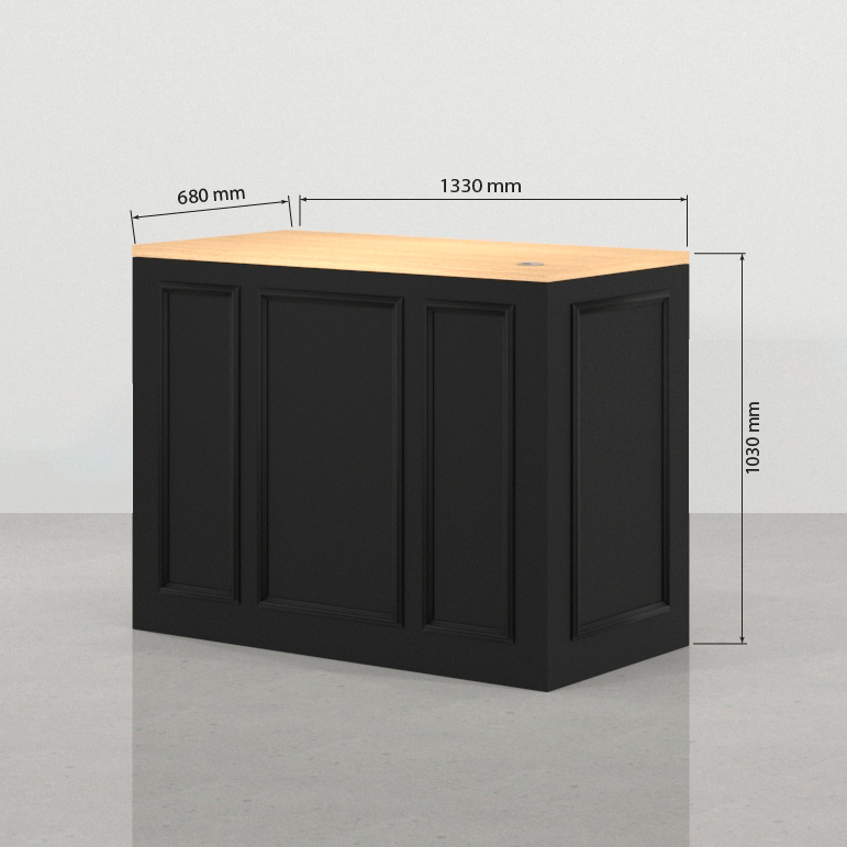 • Estructura Principal y Distinción Clásica: Los dos cuerpos del mostrador modular están construidos en una robusta Melamina Negra Lacada. Este acabado de gran profundidad y durabilidad define la personalidad del mueble de recepción, infundiendo una sensación de seriedad y exclusividad. El toque distintivo reside en las molduras solapadas lacadas que enmarcan el frontal de forma continua. Este rasgo de diseño clásico aporta una textura y una distinción que se adapta perfectamente a la resistencia que exige un punto de venta de alta actividad.