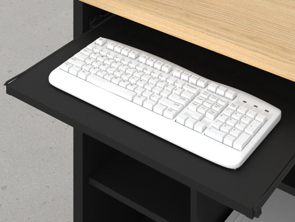 - Integra un espacio dedicado para la bandeja para PC, que oculta y protege el equipo informático, liberando la superficie de trabajo.