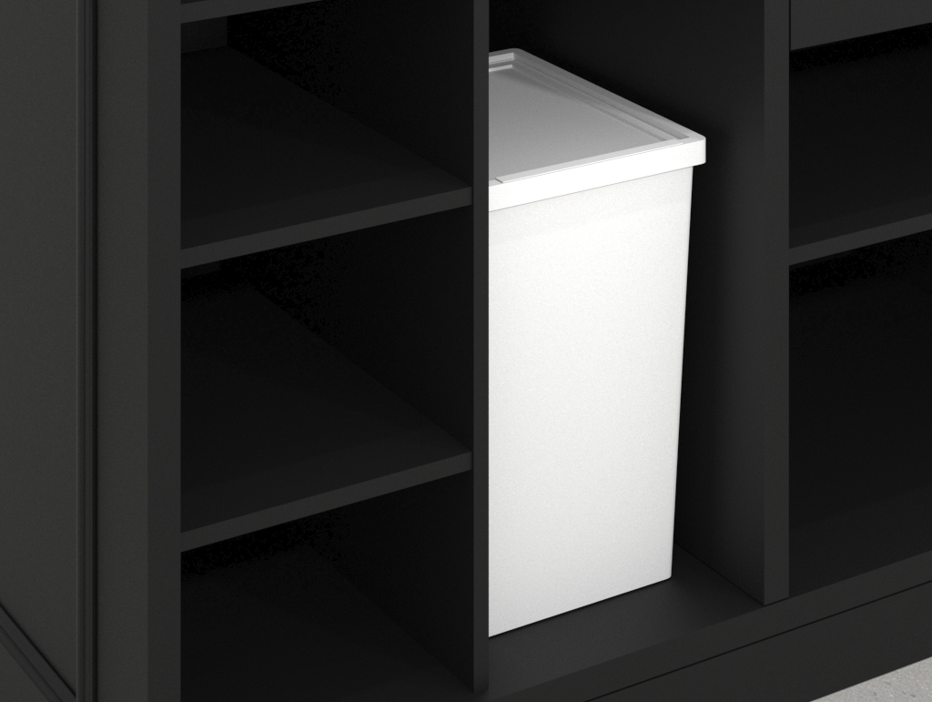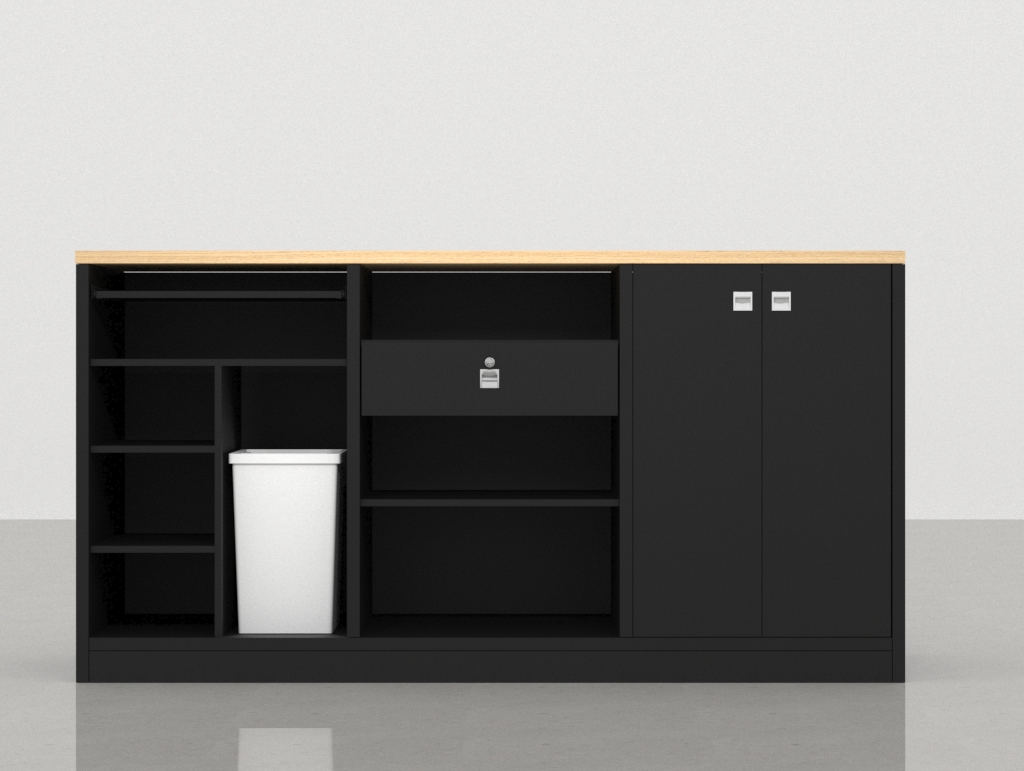 - Incluye un compartimento lateral para la papelera, crucial para mantener la pulcritud del espacio de caja y la imagen profesional.
