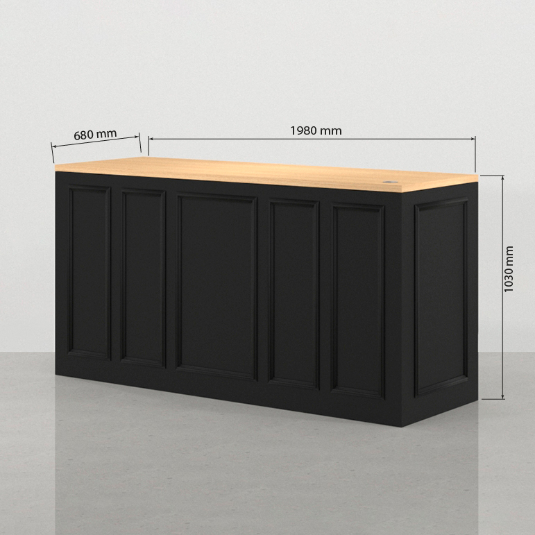 - Encimera Roble Vicenza: La extensa superficie de atención al cliente se remata con melamina de alta protección en acabado Roble Vicenza. Esta encimera ofrece el aspecto natural y el veteado de la madera clara, contrastando de manera espectacular con el negro lacado de la base. El contraste entre la intensidad oscura y la calidez del Roble Vicenza eleva la estética de todo el mueble de recepción. Además, este sobre está específicamente diseñado para ofrecer una durabilidad superior en el alto tráfico del punto de venta.
