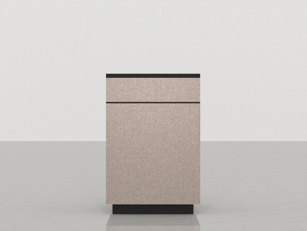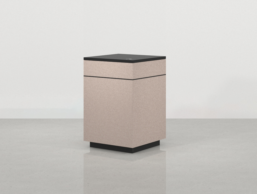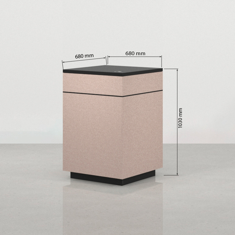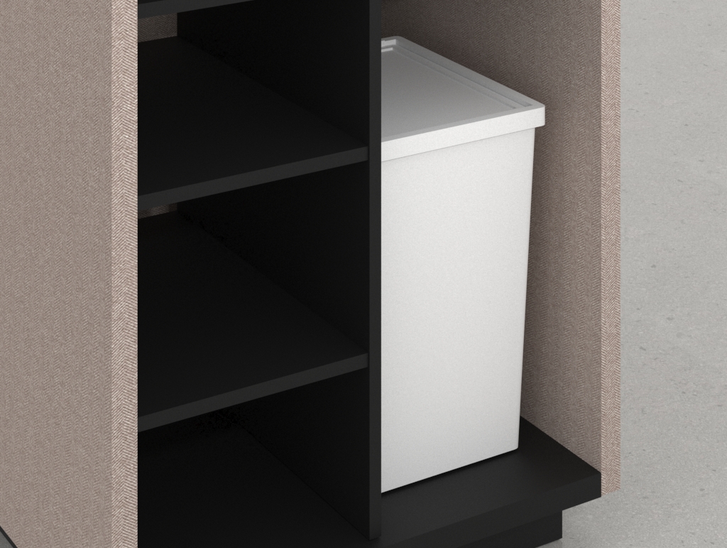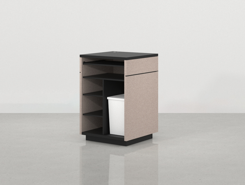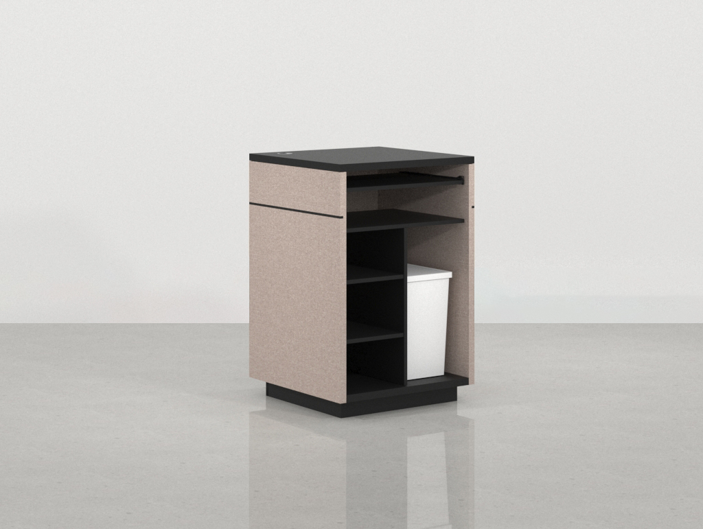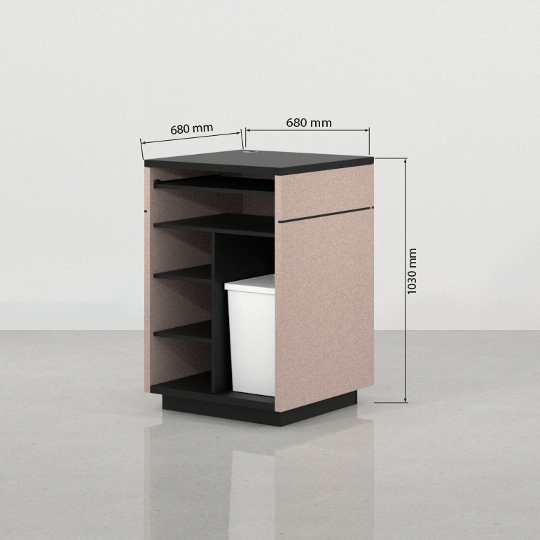 • Carcasa y sobre en Melamina Negra: El cuerpo principal y la superficie de trabajo están revestidos en melamina negra. Este color aporta un marco de seriedad, un fuerte contraste visual y resalta la forma geométrica del módulo, asegurando una superficie de fácil mantenimiento, pulcritud y profesionalidad.